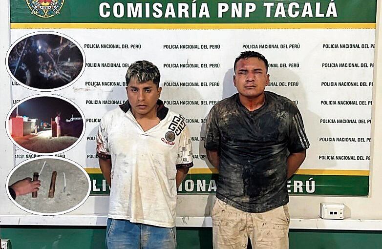 Se trata de Eduardo O.B. (32 años), “Trujillano” y Harly del Jesús V.CH. (22 años) “Muelas”, presuntos integrantes de la banda delictiva “Los Elegantes del camino”, quienes a bordo de una motocicleta, minutos antes, habrían realizado disparos al portón donde funciona el almacén de la empresa “Jvaleon Ingenieros”, que se encuentra realizando la obra de pistas y veredas en el A.H. La Primavera.