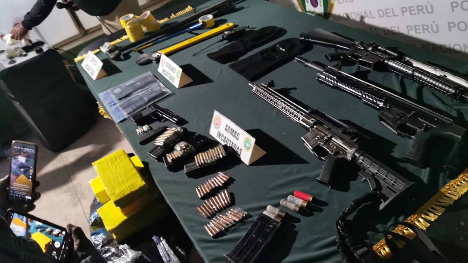 El general PNP Jorge Guardia Riveros, jefe de la región policial de Puno, informó que en el predio hallaron tres armas de largo alcance, una pistola, municiones, pata de cabra, celulares y otros objetos. El oficial agregó que en la vivienda encontraron dos vehículos con placas clonadas.