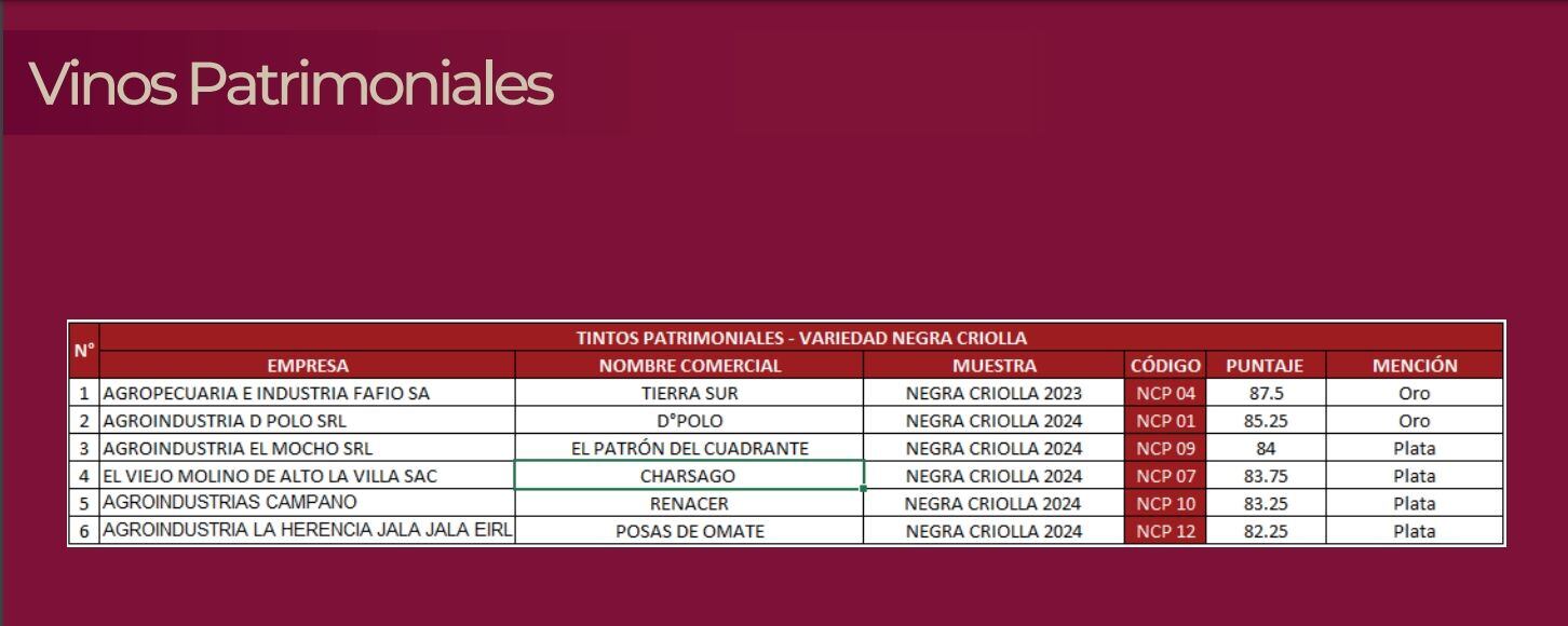En tintos patrimoniales, variedad negra criolla las dos únicas medallas de oro fueron para las bodegas tacneñas Agropecuaria e Industria Fafio S.A. con el nombre comercial de Tierra Sur que participó con la muestra negra criolla 2023 y logró un puntaje de 87.5 (oro). El segundo lugar fue para Agroindustria D’Polo SRL con el nombre comercial D’Polo y se presentó con la muestra negra criolla 2024 y alcanzó un puntaje de 85.25 (oro).