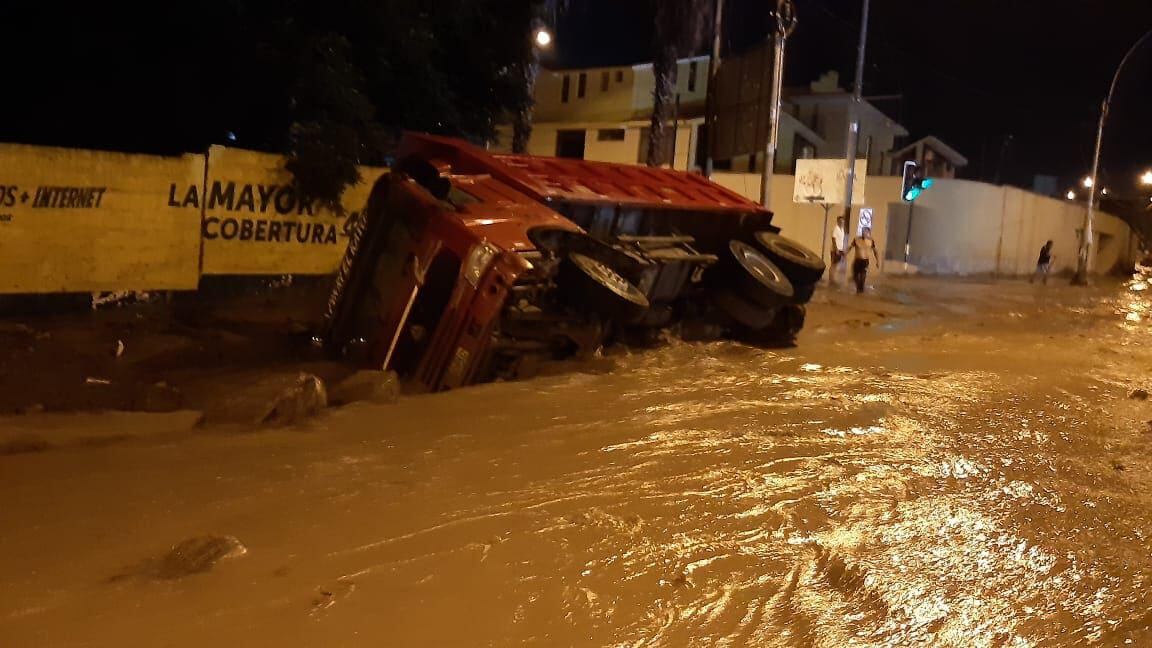 Debido a las intensas precipitaciones con consecuentes huaicos, el desastre arrasó varios vehículos a su paso que quedaron atascados o volcados por la fuerza del lodo y agua.