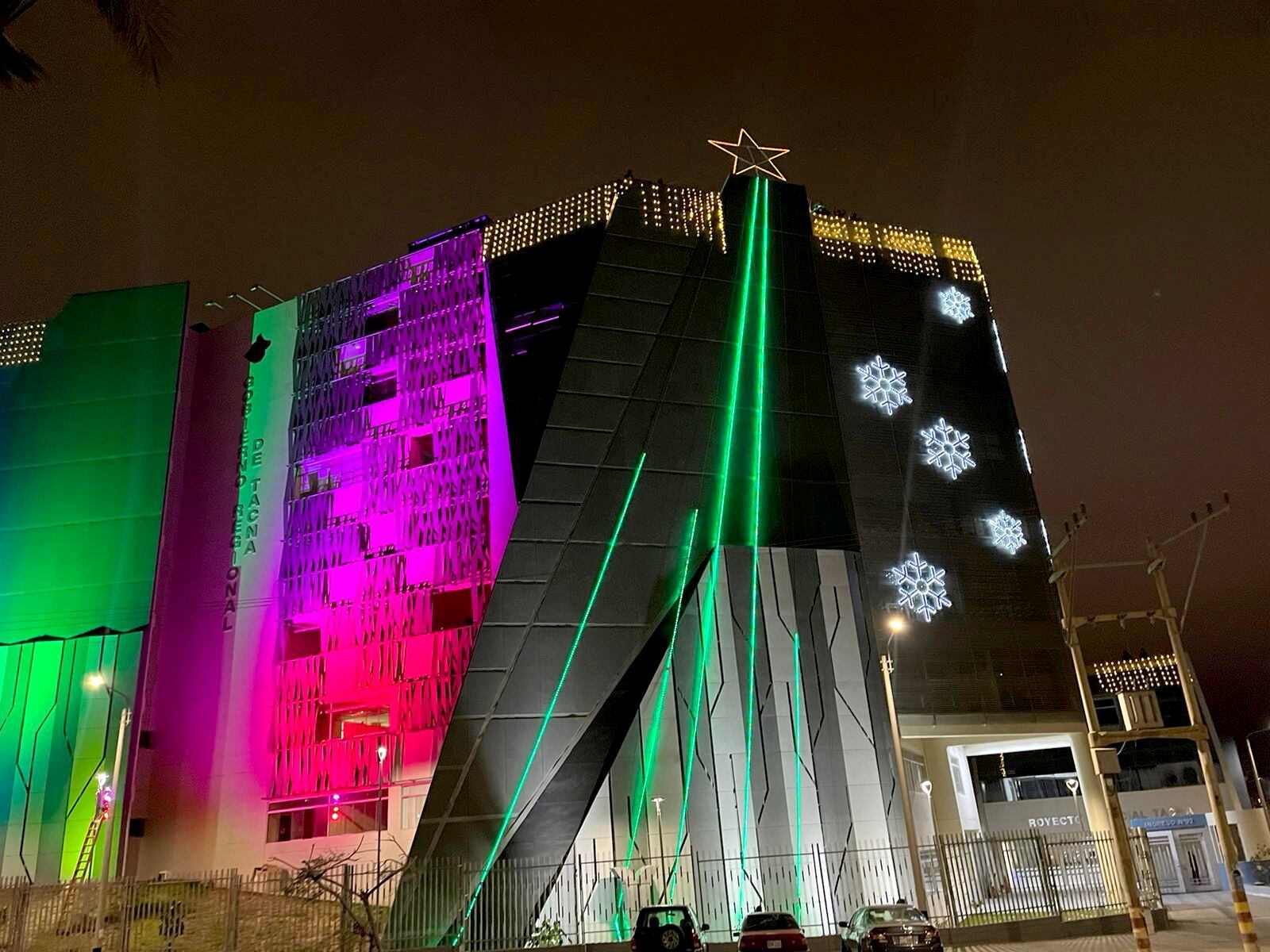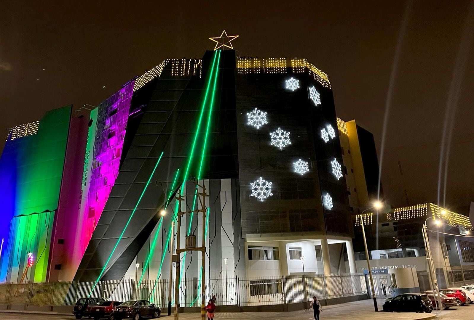 El Gobierno Regional de Tacna encenderá hoy las luces del “árbol navideño” de 40 metros de altura que se proyectará en la fachada principal del edificio de ocho pisos de la nueva sede institucional ubicada en la Av. Manuel A. Odría.