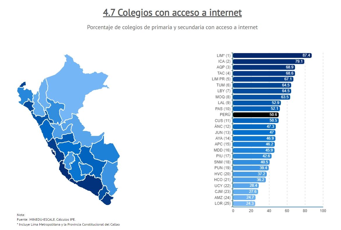 colegios con acceso a internet, lo encabeza Lima con 87.4, Tacna (4) con 68.6 y Moquegua (8) con 63.5