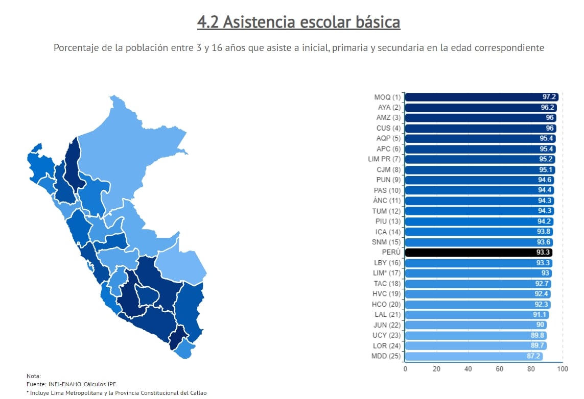 asistencia escolar básica, lo lidera Moquegua con 97.2 y Tacna (18) con 92.7