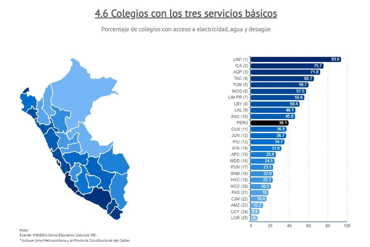colegios con los tres servicios básicos lo encabeza Lima con el 93.6, Tacna (4) con 65.7 y Moquegua (6) alcanzó 57.5