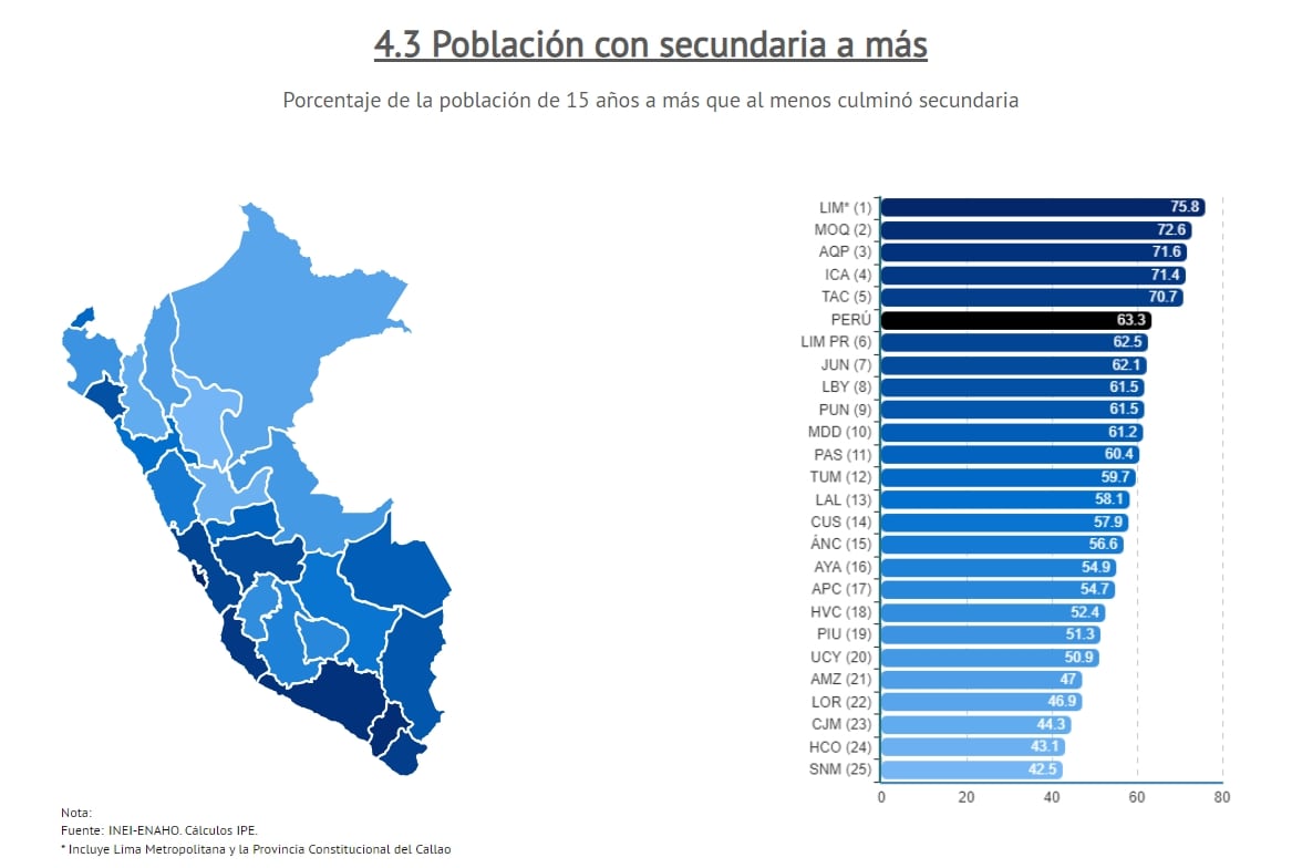 población con secundaria a más, lo lidera Lima con 75.8, Moquegua (2) con 72.6 y Tacna (5) logró 70.7