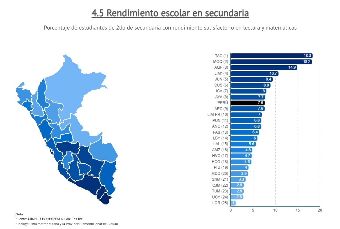 rendimiento escolar en secundaria, lo lidera Tacna con 18.3 y Moquegua (2) con 18.2