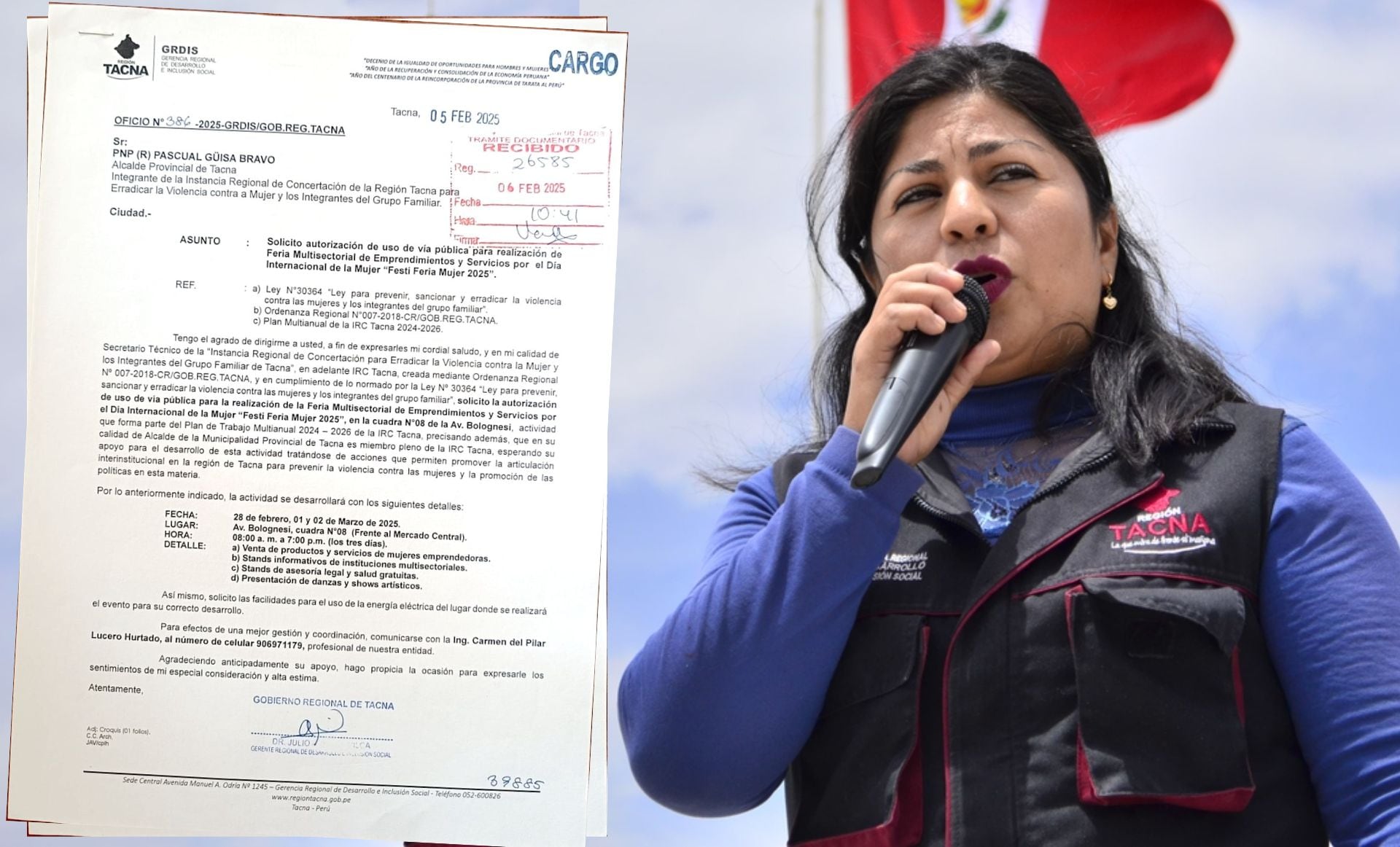 La Gerencia de Desarrollo e Inclusión Social del GORE Tacna mediante oficio N° 386-2025-GRDIS/GRT, de fecha 5 de febrero de 2025, solicitó al alcalde provincial de Tacna Cnel PNP (r) Pascual Guisa Bravo autorización del uso de la vía pública para la Feria Multisectorial de Emprendimientos y Servicios por el Día Internacional de la Mujer “Festi Feria Mujer 2025″ que se realizará los días 28 de febrero, 1 y 2 de marzo del presente año en la cuadra N° 8 de la Av. Bolognesi (frente al Mercado Central).