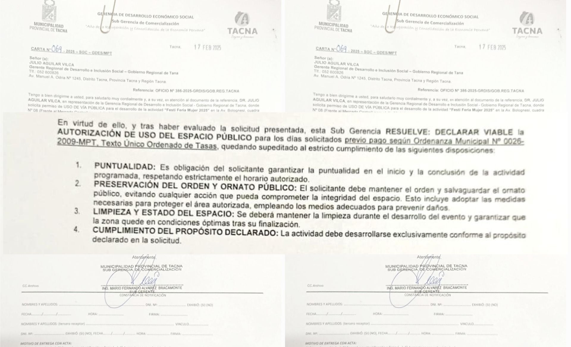 Lucero Hurtado señaló que ya había un documento de la Subgerencia de Comercialización de la MUNI Tacna, de fecha 17 de febrero de 2025, que declaraba viable la autorización del uso de la vía pública, pero inexplicablemente hoy le respondieron que no se atenderá la solicitud. Añadió que incluso le dijeron que si usaban la vía pública sin autorización serían desalojados.