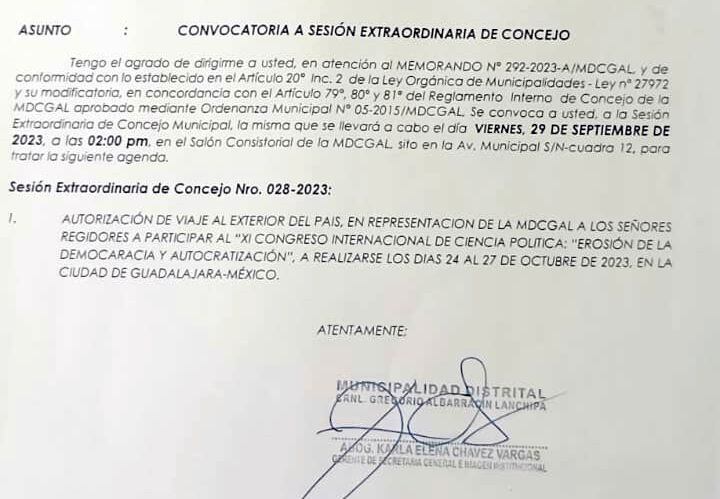 El único punto de agenda de la sesión extraordinaria N° 028-2023 fue la autorización de viaje al exterior del país en representación de la Municipalidad Distrital Coronel Gregorio Albarracín a los señores regidores a participar en el XI Congreso Internacional de Ciencia Política: “Erosión de la democracia y autocratización” a realizarse los días del 24 al 27 de octubre en la ciudad de Guadalajara - México.