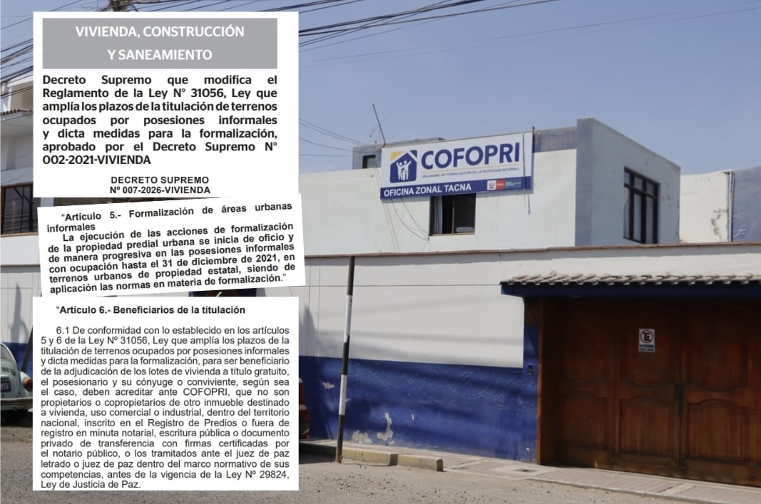 En Tacna esta semana empezó a aplicarse la nueva ley que amplía el plazo de formalización de predios del Estado con posesión informal hasta el 31 de diciembre de 2021, ello tras la publicación el pasado viernes 24 de abril del D.S. 007-2026-VIVIENDA que aprueba el reglamento de la Ley N° 32267.