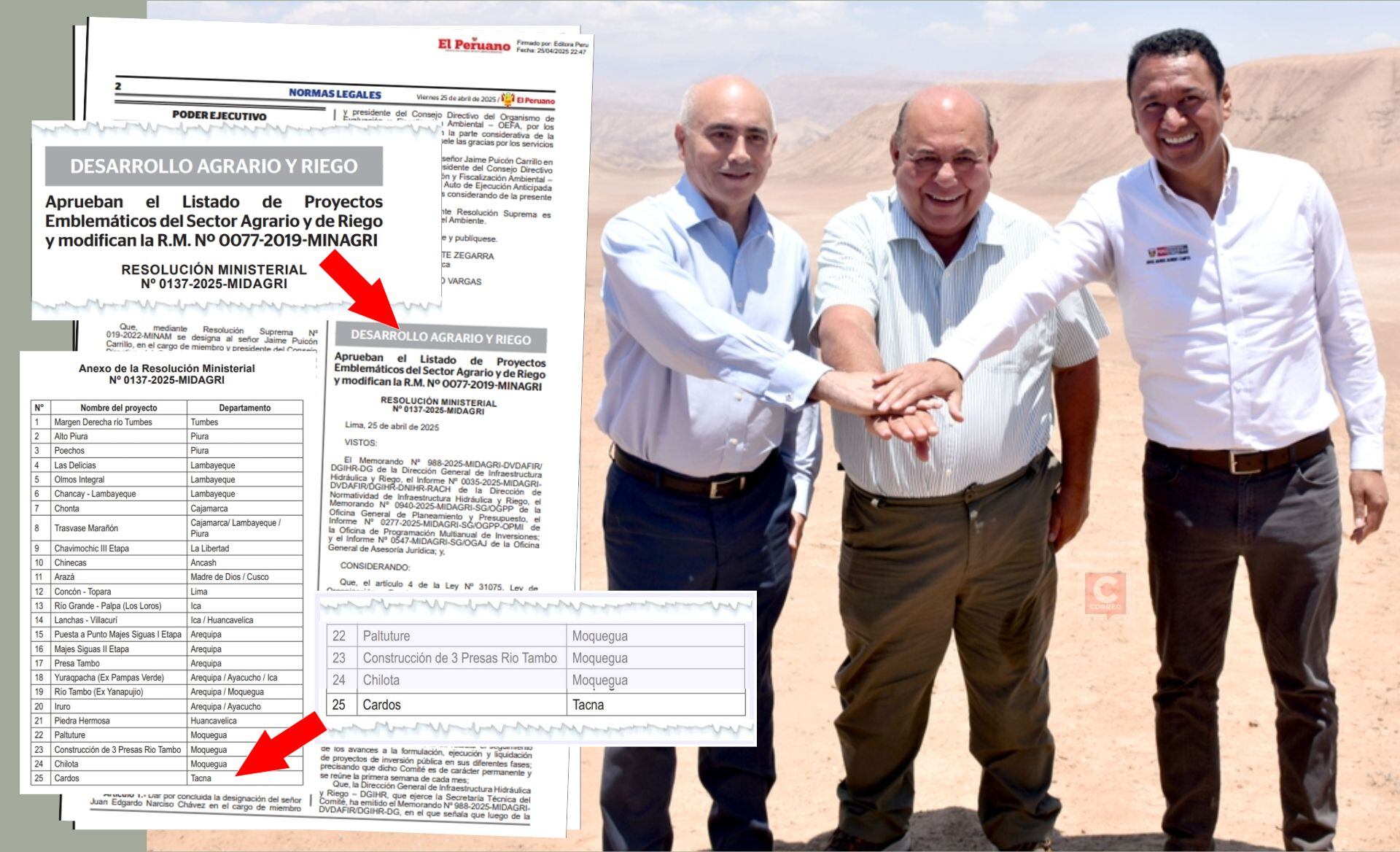 Recordó que en el 2019 el proyecto emblemático de Tacna era Vilavilani, pero al quedar postergada, en la actualización del Minagri ya no aparece, sino que se incluyó a Cardos.
