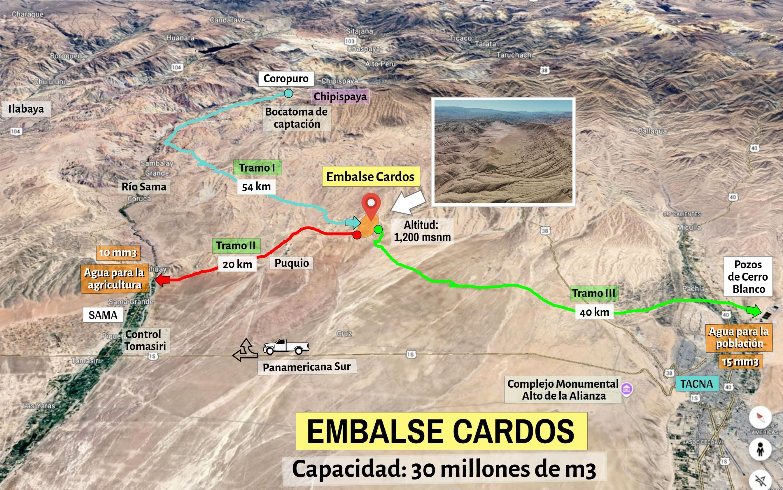 La captación de agua será del río Sama en temporada de avenidas. El punto de captación estará en el sector de Coropuro, en la comunidad de Chipispaya. El primer tramo comprende la construcción de un canal de 54 kilómetros que llegará al embalse Cardos. El segundo tramo el entubado de unos 20 Km de Cardos al valle de Sama, y el tercer tramo el entubado de unos 40 Km de Cardos a los pozos del PET en Cerro Blanco.