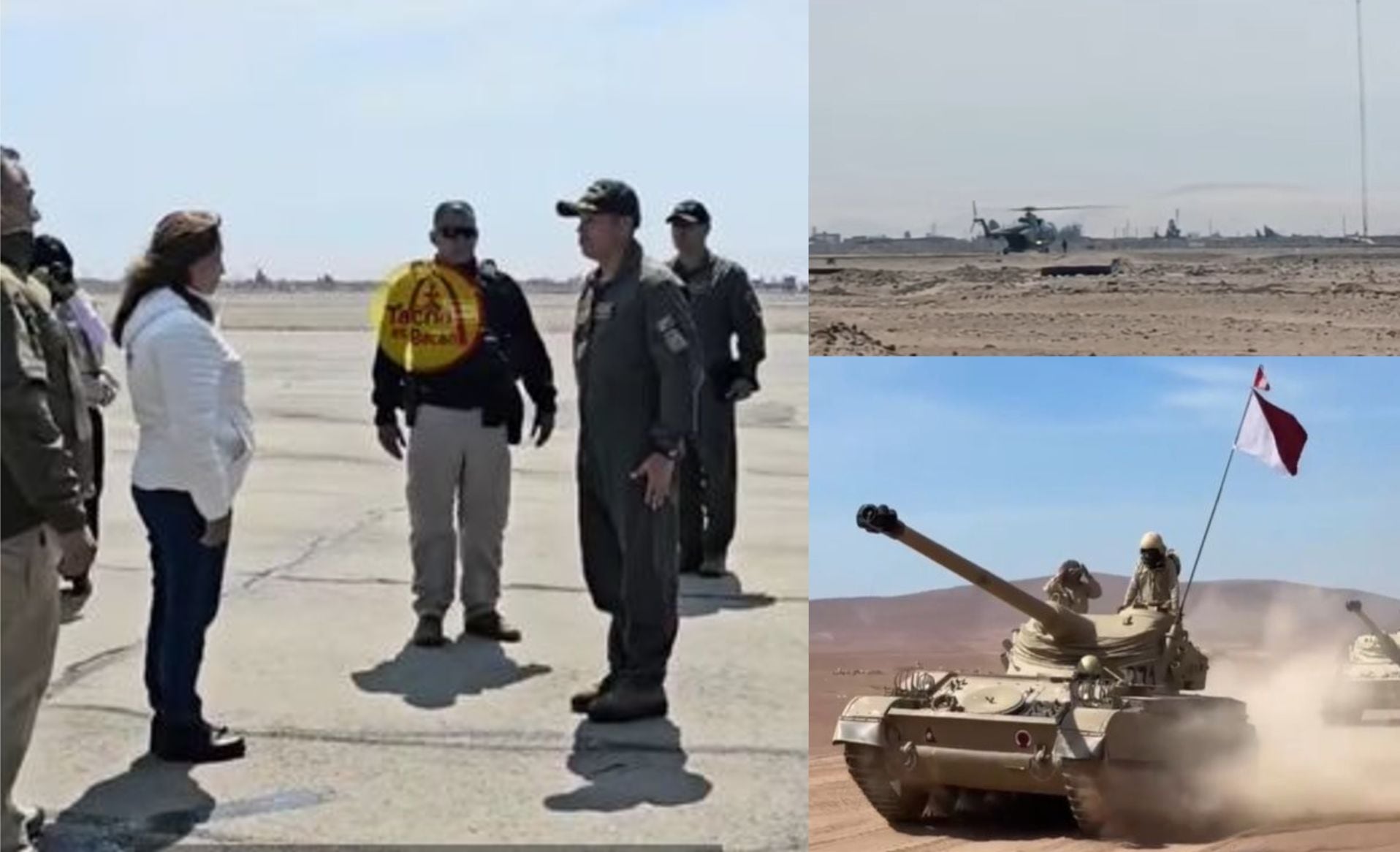 La presidenta de la República Dina Boluarte Zegarra arribó esta mañana al aeropuerto internacional Crnl. FAP Carlos Ciriani Santa Rosa de Tacna y casi de inmediato abordó un helicóptero del Ejército para dirigirse al cuartel Fuerte Arica, en Locumba, provincia Jorge Basadre, donde se realizará maniobras militares con el material bélico y personal de las diferentes unidades de la Tercera División del Ejército y la Tercera Brigada de Caballería.