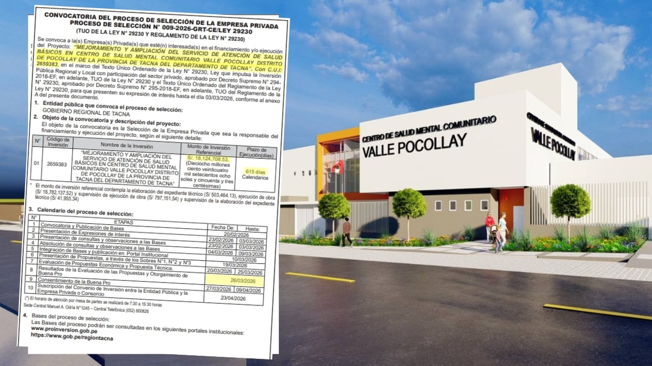 La convocatoria del proceso de selección N° 009-2026-GRT-CE/Ley 29230 se publicó el pasado 20 de febrero en el diario oficial El Peruano. El plazo de ejecución es de 615 días calendarios. El monto referencial incluye elaboración del expediente técnico (S/ 503 464.13), ejecución de la obra (S/ 16 782 137.52) y supervisión de ejecución de obra (S/ 797 151.54), y supervisión de la elaboración del expediente técnico (S/ 41 955.34).