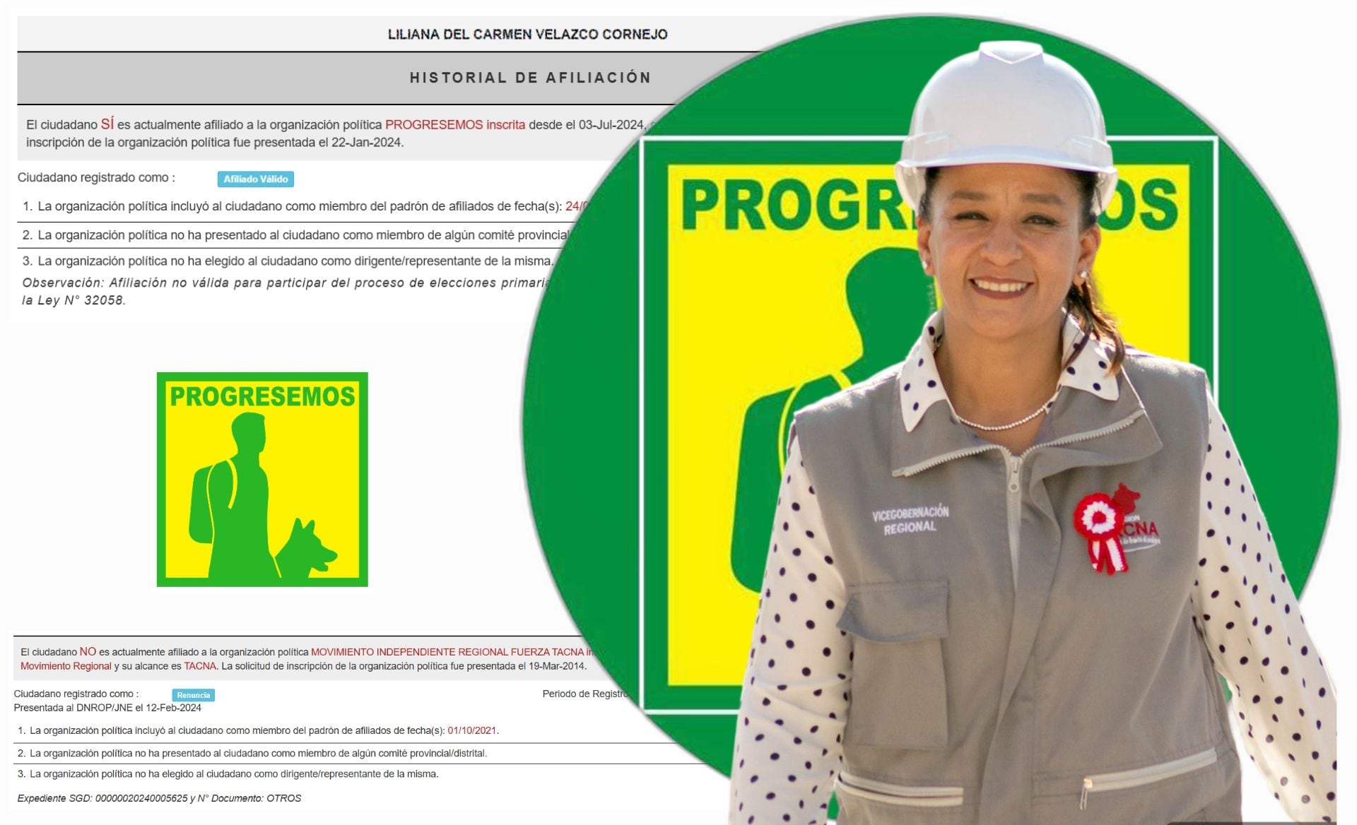 La vicegobernadora regional de Tacna Liliana del Carmen Velazco Cornejo se afilió al nuevo partido político Progresemos, que tiene como fundador y presidente al abogado Paúl Jaimes Blanco.