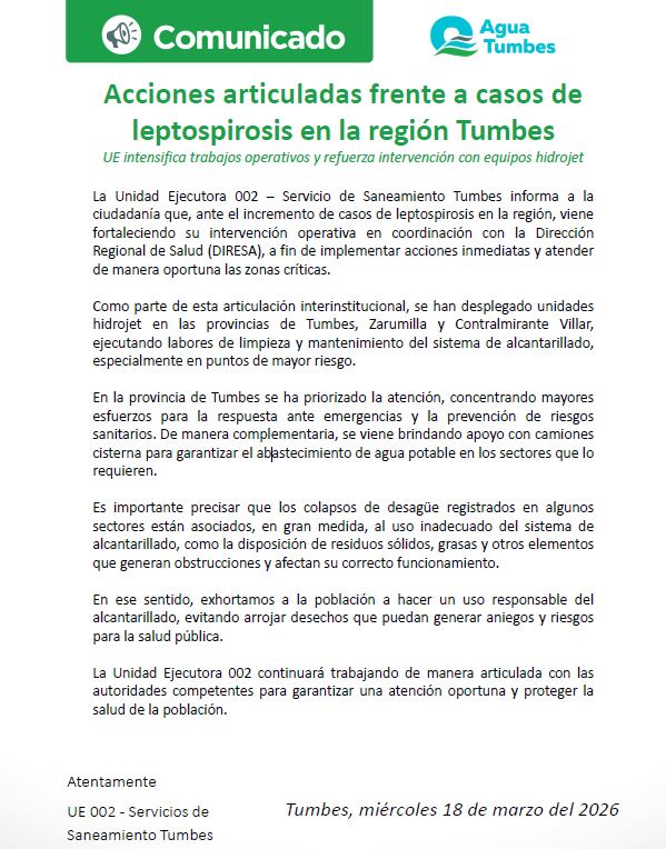 La Unidad Ejecutora 002 – Servicio de Saneamiento Tumbes anunció el refuerzo de acciones operativas en coordinación con la Dirección Regional de Salud de Tumbes.