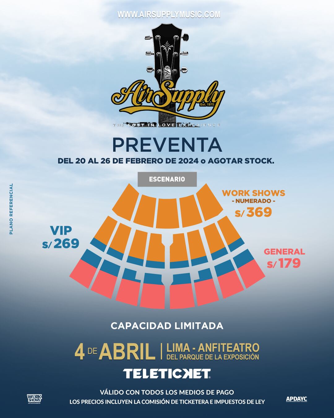 Las entradas para el concierto de Air Supply en Lima están disponibles desde el lunes 19 de febrero en la plataforma web y puntos de venta físicos de Teleticket, con un costo desde S/179, incluyendo la comisión de ticketera e impuestos de ley (Capacidad limitada).