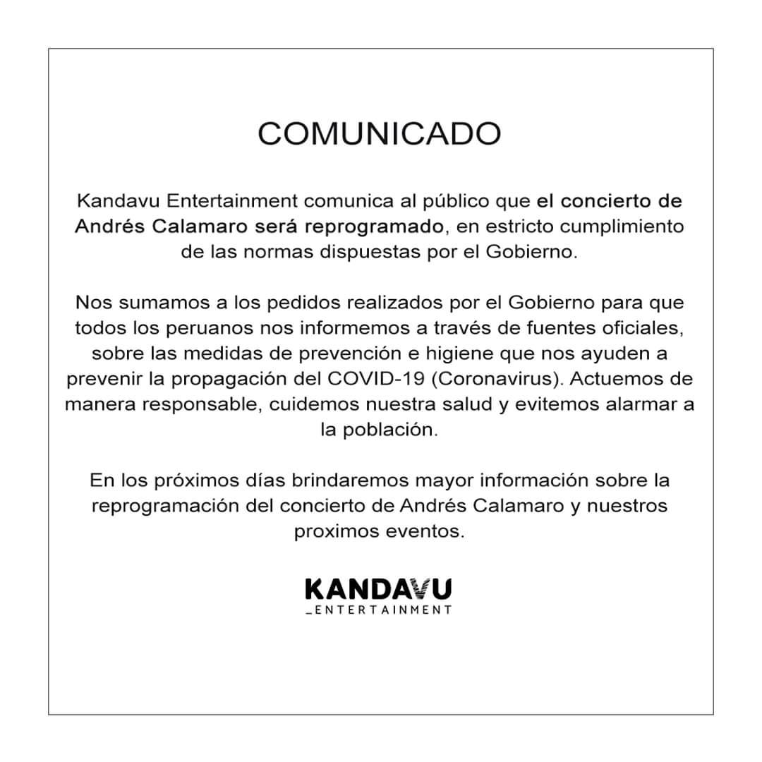 Cabe mencionar que por el momento la presentación de Andrés Calamaro el próximo jueves 2 de abril en el Jardín de la Cerveza, en Arequipa, aún se encuentra en suspenso debido a la situación que se ha generado por la expansión del COVID-19.