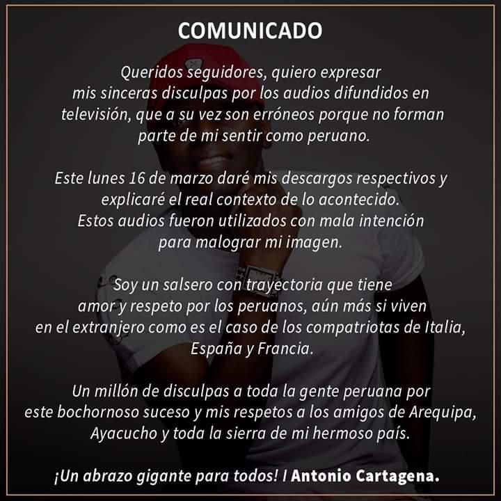 “Soy un salsero con trayectoria que tiene amor y respeto por los peruanos, aún más si viven en el extranjero como es el caso de los compatriotas de Italia, España y Francia. Un millón de disculpas a toda la gente peruana por este bochornoso suceso y mis respetos a los amigos de Arequipa, Ayacucho y toda la sierra de mi hermoso país”, agregó en su comunicado sin detallar en qué medio dará su descargo sobre el audio.