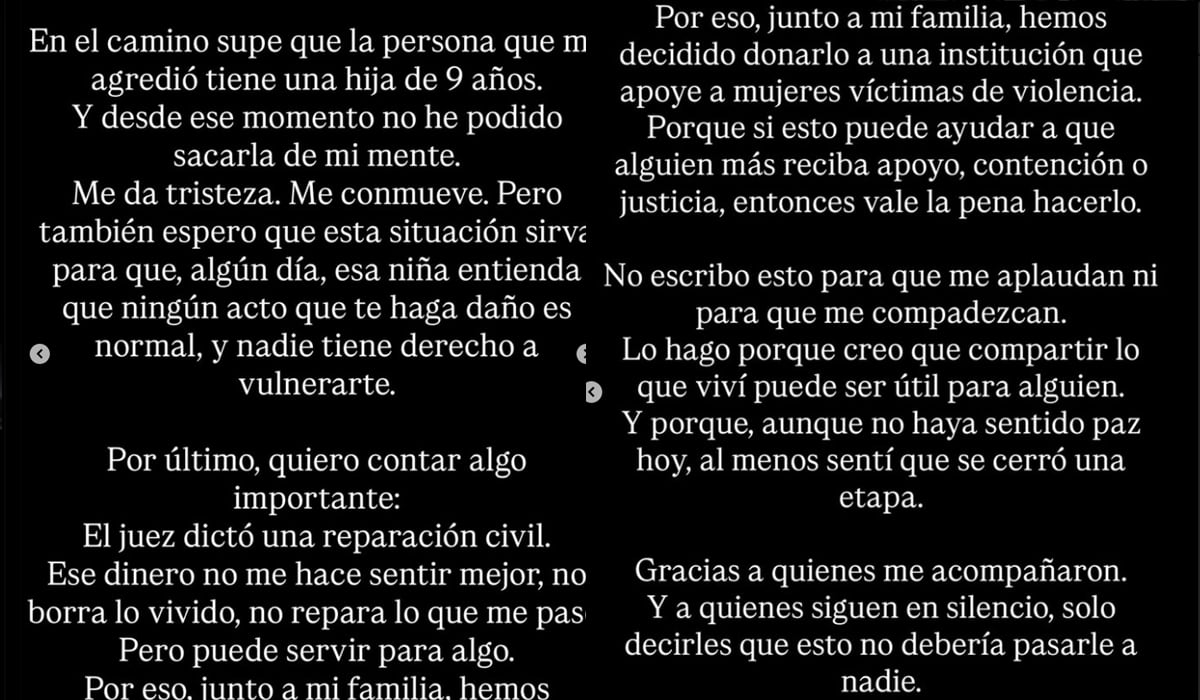 “Durante la sentencia este hombre llora pidiéndome disculpas por lo que hizo y por como me hizo sentir, es irónico porque en un inicio lo único que yo pedía era que se disculpen conmigo por lo que hicieron TODOS ELLOS”, escribió en su cuenta de Instagram.