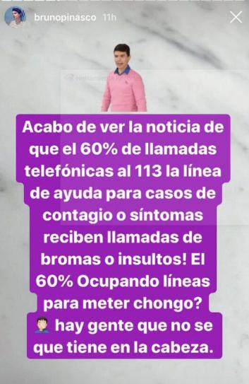 “¡Acabo de ver la noticia de que el 60% de llamadas telefónicas al 113 (la linea de ayuda para casos de contagio o síntomas) reciben llamadas de bromas o insultos! ¿El 60% ocupando líneas para meter ‘chongo’? Hay gente que no sé qué tiene en la cabeza”, escribió Pinasco.