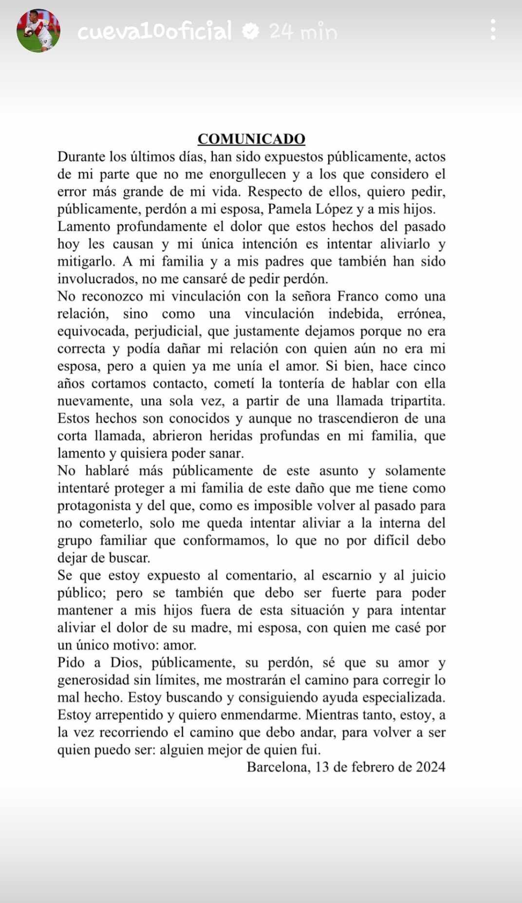 “No reconozco mi vinculación con la señora Franco como una relación, sino como una vinculación indebida, errónea, equivocada, perjudicial, que justamente dejamos porque no era correcta y podía dañar mi relación con quien aún no era mi esposa, pero a quien ya me unía el amor. Si bien, hace cinco años cortamos contacto, cometí la tontería de hablar con ella nuevamente, una sola vez, a partir de una llamada tripartita”, se lee en el comunicado de Cueva.