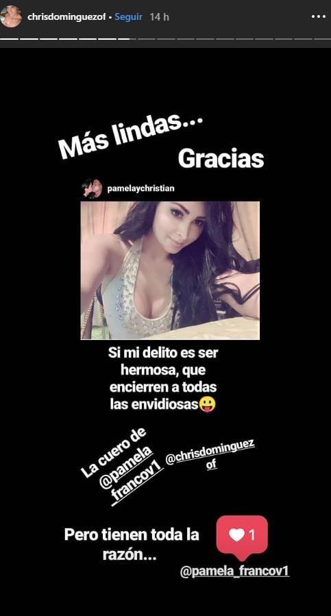Tras ver el informe del programa de espectáculos, Christian Domínguez utilizó su cuenta de Instagram para compartir un mensaje que le envió un club de fans de la pareja. “Si mi delito es ser hermosa, que encierren a todas las envidiosas”, se lee en el post.