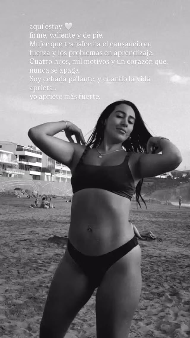 “Aquí estoy. Firme, valiente y de pie. Mujer que transforma el cansancio en fuerza y los problemas en aprendizaje. Cuatro hijos, mil motivos y un corazón que nunca se apaga. Soy echada pa’lante y, cuando la vida aprieta, yo aprieto más fuerte”, escribió en su cuenta oficial de Instagram.