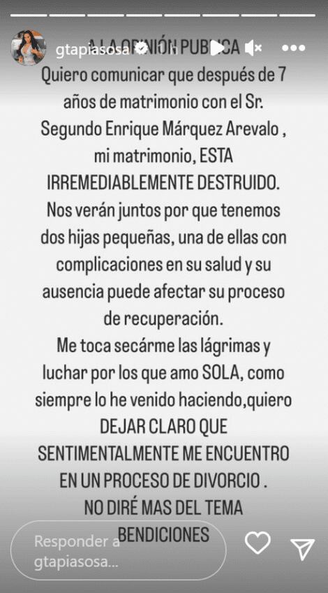 Mediante de su cuenta de Instagram, Tapia envió un comunicado donde anunciaba el fin de su matrimonio, aunque no quiso dar los motivos de esta decisión. “Quiero comunicar que después de 7 años de matrimonio que con el Sr. Segundo Enrique Márquez Arevalo, mi matrimonio, ESTÁ IRREMEDIABLEMENTE DESTRUÍDO”, se lee en las primeras líneas.