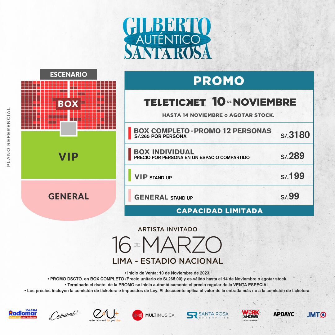 Las entradas para el concierto de Gilberto Santa Rosa en Lima están disponibles desde el viernes 10 de noviembre en la plataforma web y puntos de venta físicos de Teleticket, con un costo desde S/.99, incluyendo la comisión de ticketera e impuestos de ley.