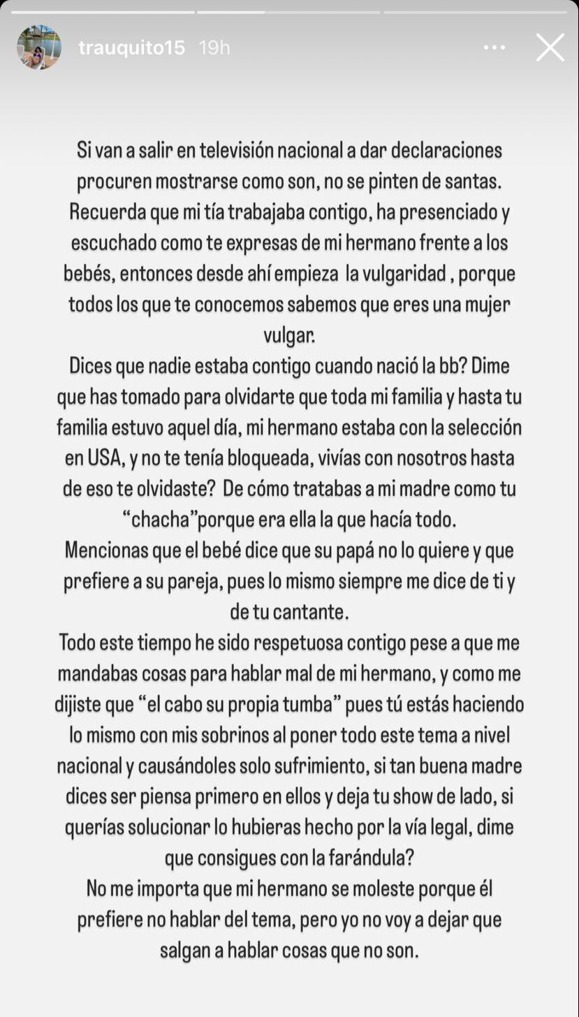 “Dices que nadie estaba contigo cuando nació la bebe... Dime qué has tomado para olvidarte que toda mi familia y hasta tu familia estuvo aquel día. Mi hermano estaba con la selección en USA y no te tenía bloqueada, vivías con nosotros, ¿hasta de eso te olvidaste? De cómo tratabas a mi madre como tu ‘chacha’ porque ella era la que hacía todo”, añadió.