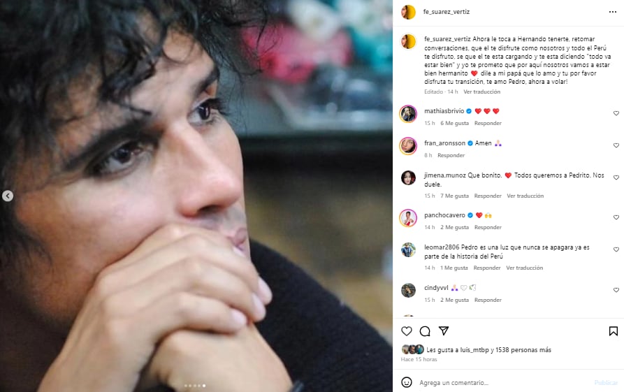 “Ahora le toca a Hernando tenerte, retomar conversaciones, que el te disfrute como nosotros y todo el Perú te disfruto, se que el te esta cargando y te esta diciendo ‘todo va estar bien’ y yo te prometo que por aquí nosotros vamos a estar bien hermanito, dile a mi papá que lo amo y tu por favor disfruta tu transición, te amo Pedro, ahora a volar”, se lee en su sentido post.