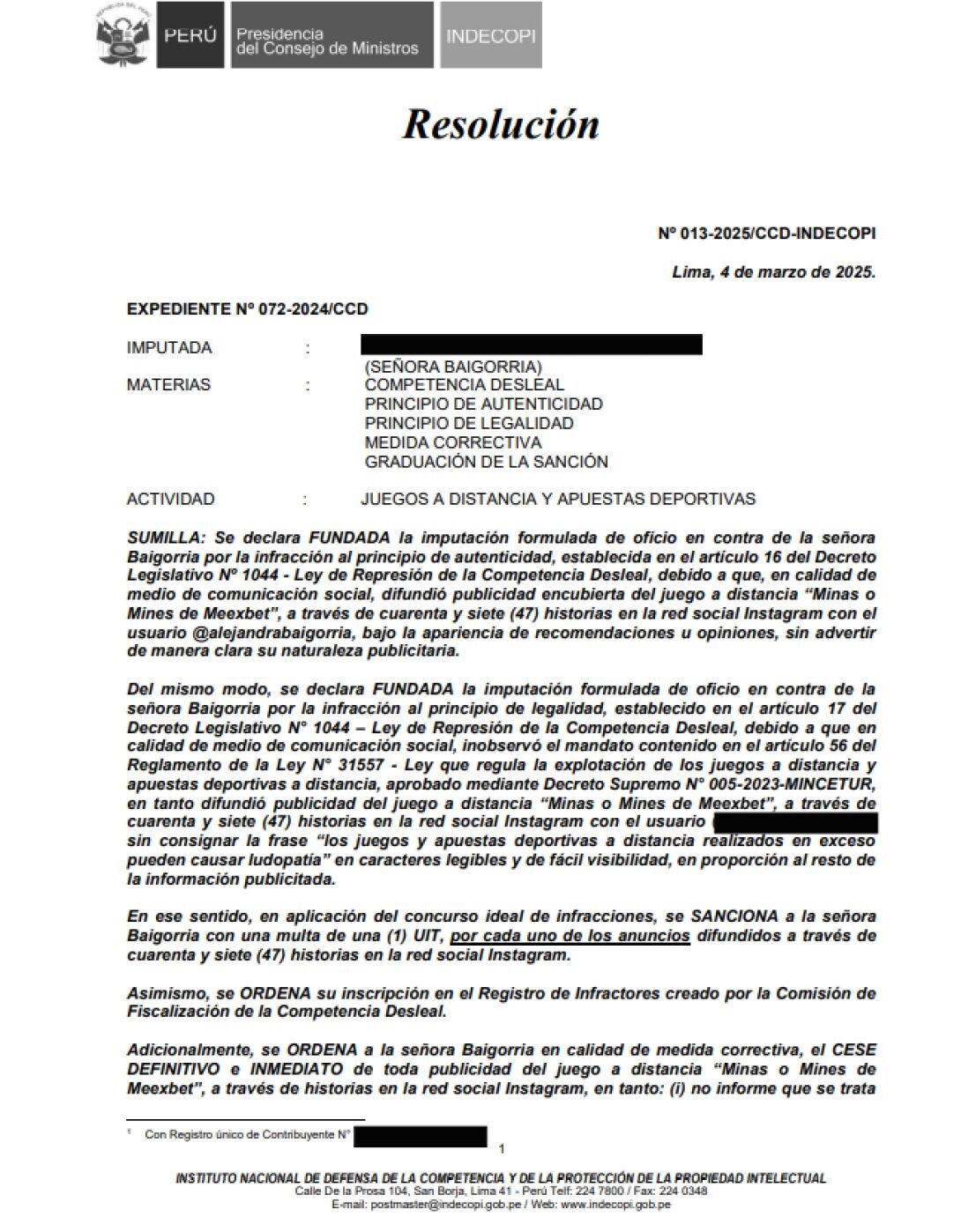 El Instituto Nacional de Defensa de la Competencia y de la Protección de la Propiedad Intelectual (Indecopi) impuso una multa de 47 UIT (S/251,450) a la influencer Alejandra Baigorria por promocionar un juego de apuestas en Instagram sin identificar el contenido como publicidad pagada ni incluir las advertencias legales requeridas.