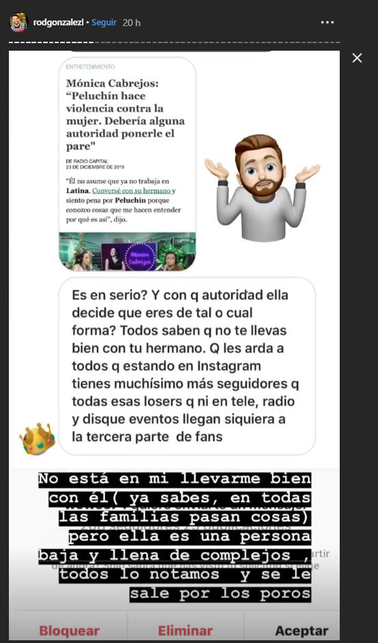 El popular Peluchín, utilizó sus redes sociales para contestar los comentarios de la periodista: “No está en mi llevarme bien con él (su hermano), pero ella es una persona baja y llena de complejos, todos lo notamos y se le sale por los poros”.