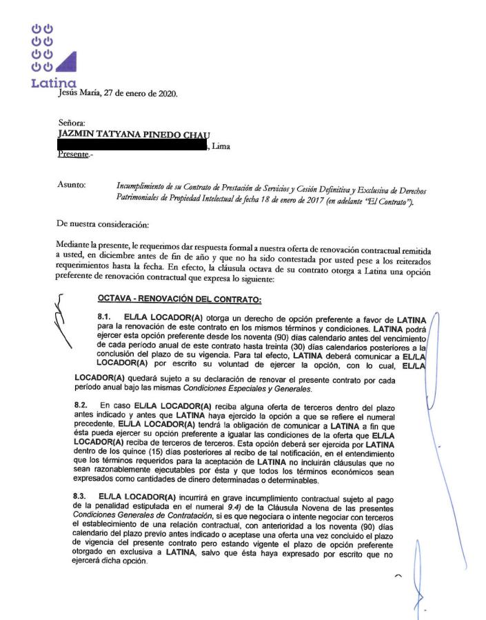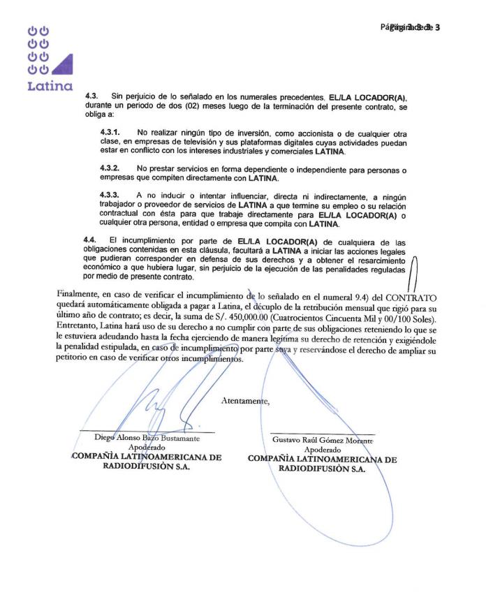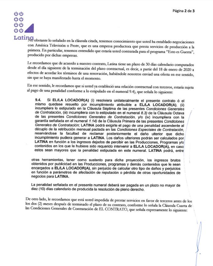 "En caso de verificar el incumplimiento de lo señalado... quedará automáticamente obligada a pagar a Latina, la suma de S/ 450,000.00 (cuatrocientos cincuenta mil soles)”, se lee en la carta notarial dirigida a la conductora de televisión.
