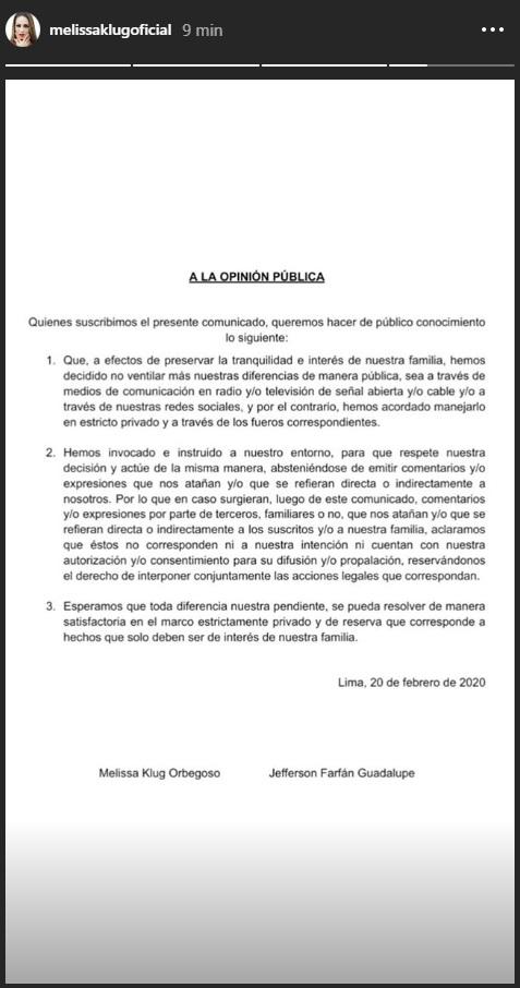 “Esperamos que toda diferencia nuestra pendiente, se pueda resolver de manera satisfactoria en el marco estrictamente privado y de reserva que corresponde a hechos que solo deben ser de interés de nuestra familia”, concluye el comunicado de Jefferson Farfán y Melissa Klug.