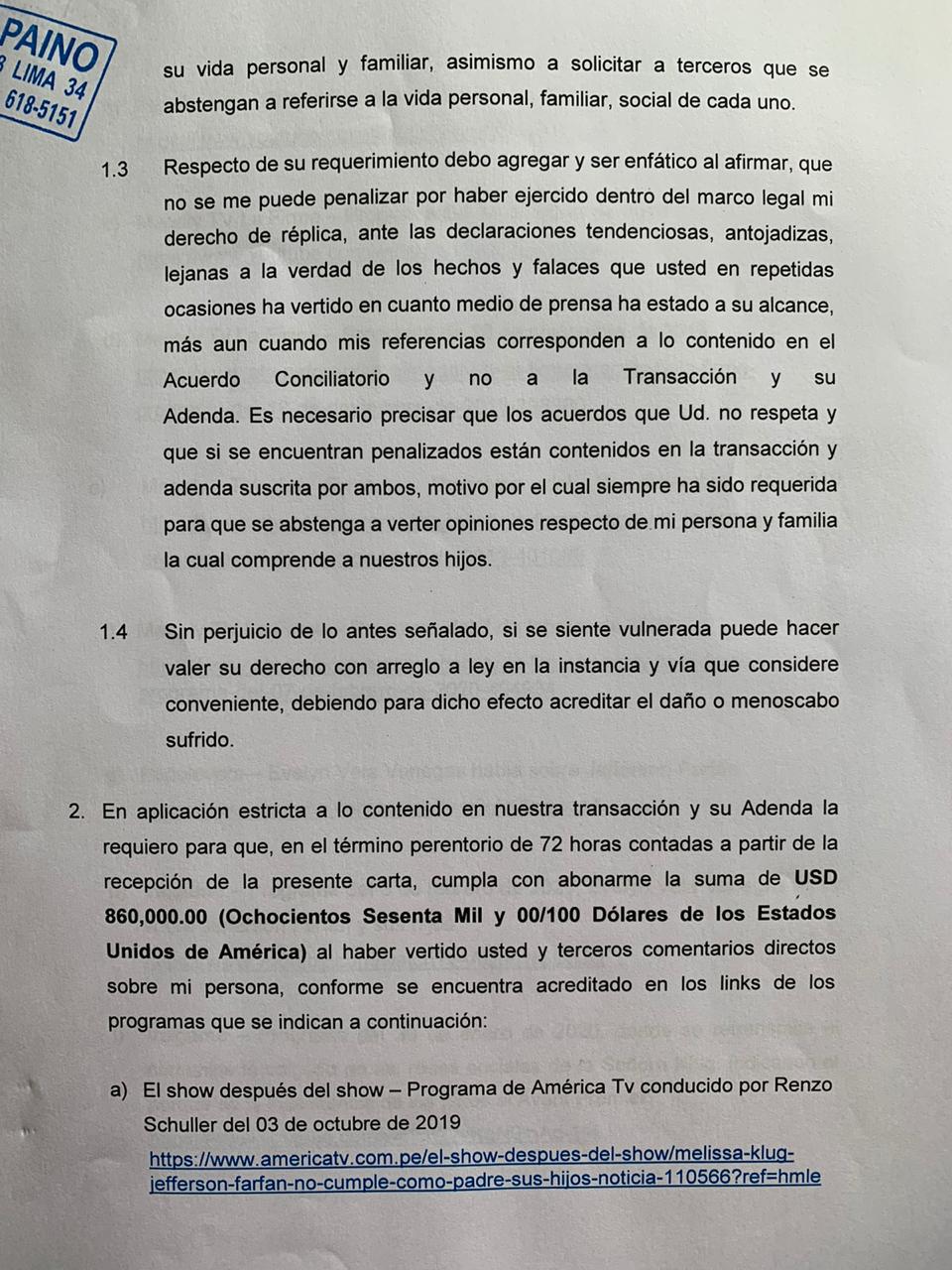 La conductora de televisión Magaly Medina reveló en su programa que el futbolista Jefferson Farfán respondió a la carta notarial de su expareja Melissa Klug con la misma medida legal para exigirle 860 mil dólares por hablar de él en diferentes canales de televisión.
