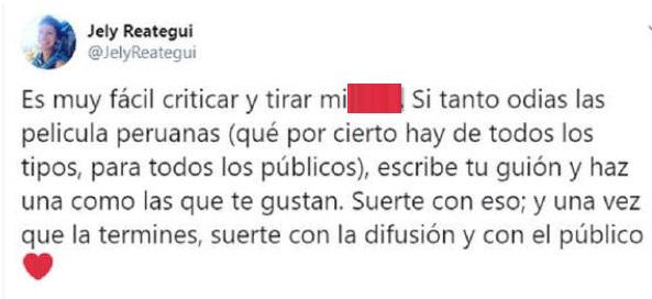 "Es muy fácil criticar y tirar mier... Si tanto odias las película peruanas (qué por cierto hay de todos los tipos, para todos los públicos), escribe tu guión y haz una como las que te gustan. Suerte con eso; y una vez que la termines, suerte con la difusión y con el público”, escribió la artista.