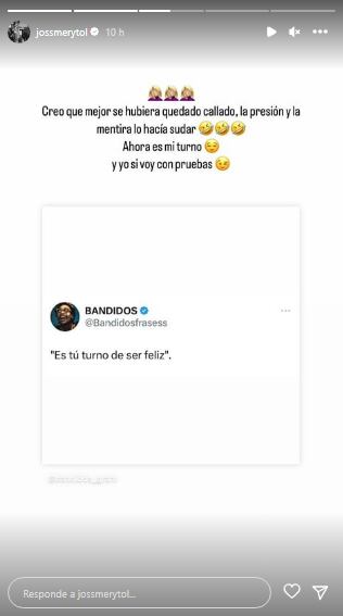 A través de su cuenta de Instagram, Jossmery Toledo le advirtió a Paolo Hurtado que lo expondrá con pruebas. “Creo que mejor se hubiera quedado callado, la presión y la mentira lo hacía sudar. Ahora es mi turno y yo sí voy con pruebas”, escribió en una de sus historias, donde añadió una imagen con la frase: “Es tu turno de ser feliz”.