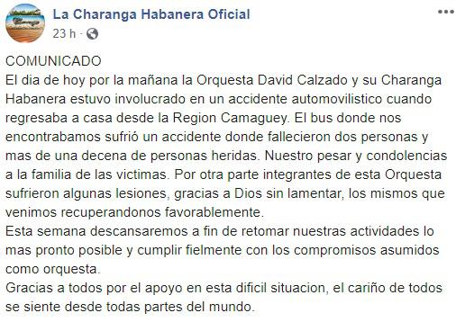 “El día de hoy por la mañana la Orquesta David Calzado y su Charanga Habanera estuvo involucrado en un accidente automovilístico cuando regresaba a casa desde la Región Camaguey. El bus donde nos encontrábamos sufrió un accidente donde fallecieron dos personas y más de una decena de personas heridas. Nuestro pesar y condolencias a la familia de las victimas”, se lee en el pronunciamiento.
