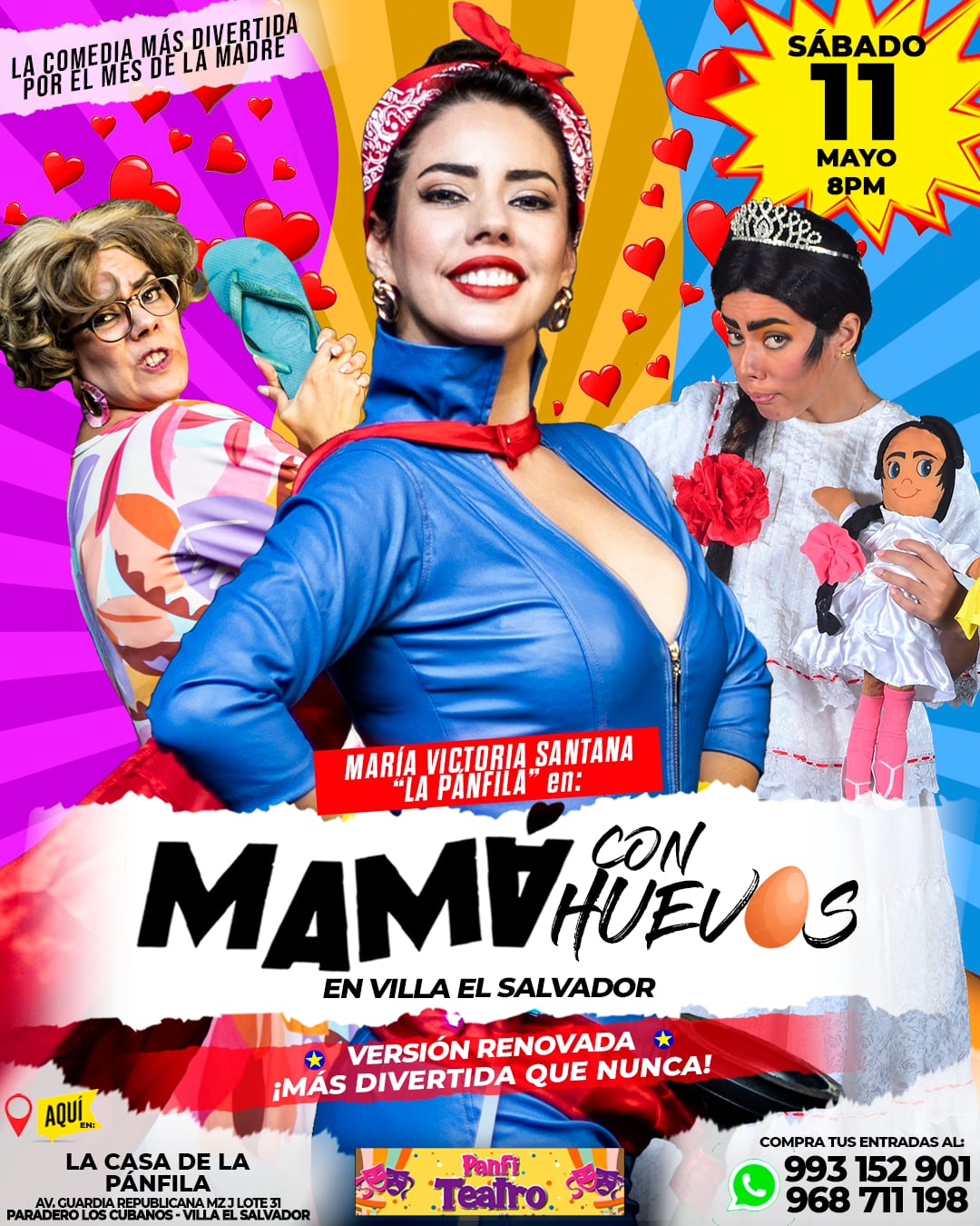 La querida actriz cómica presenta su unipersonal ‘Mamá con Huevos’, este 11 de mayo en el PanfiTeatro (Av. Guardia Republicana Mz J lote 31 - Paradero Los Cubanos - Villa El Salvador). Las entradas las pueden conseguir por WhatsApp: 993-152-901.