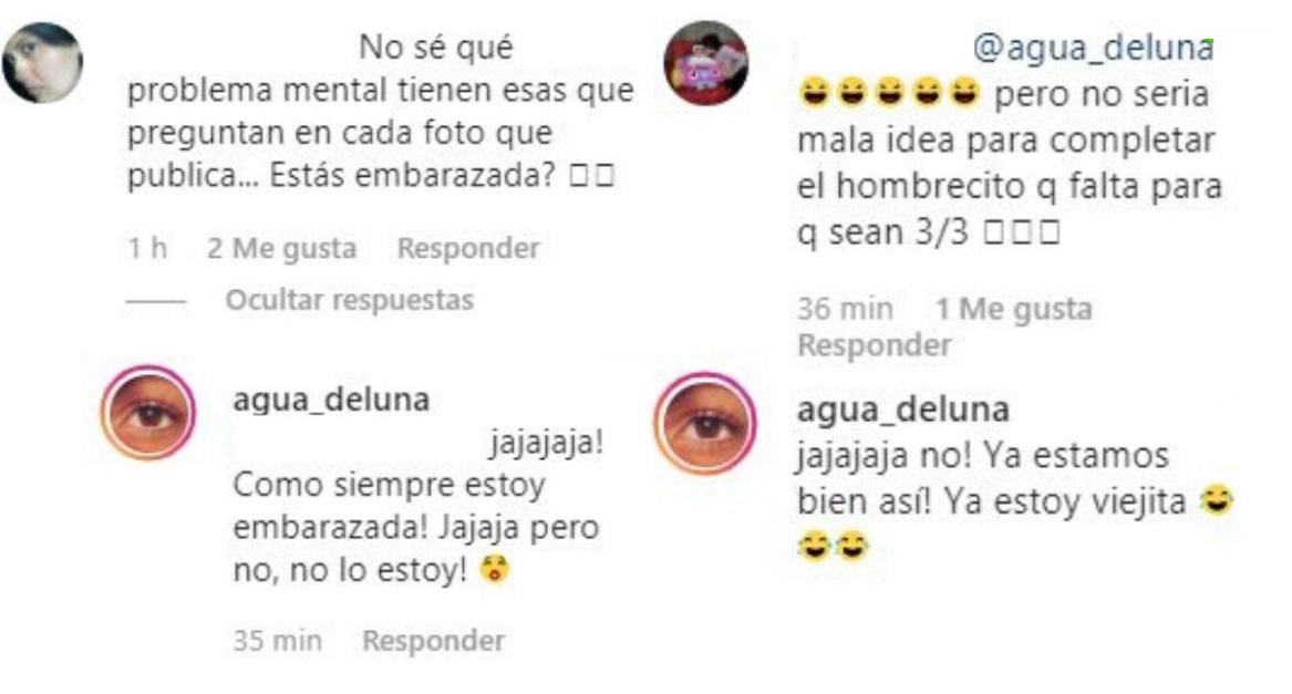 “Jajajaja! Como siempre estoy embarazada! Jajaja pero no, no lo estoy!”, escribió en un primer momento. En respuesta a otro comentario indicó: “Jajajaja... ¡No! Estamos bien así... ¡Ya estoy viejita!”.