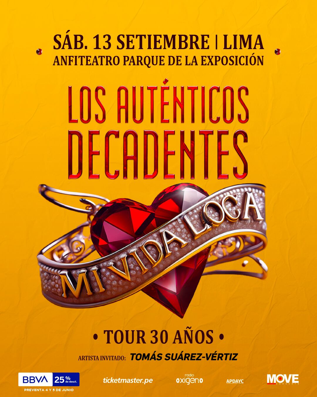 Los Auténticos Decadentes, una de las bandas más influyentes del rock latinoamericano, regresan a Lima para celebrar los 30 años de su emblemático disco “Mi Vida Loca”, con un concierto especial que se realizará el sábado 13 de septiembre en el Anfiteatro del Parque de la Exposición. Las entradas ya están disponibles en Ticketmaster, con descuentos especiales del 25% para quienes compren con tarjetas BBVA durante la preventa del 4 y 5 de junio.
