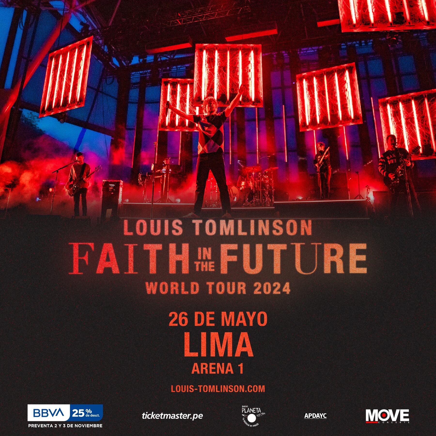 La gira mundial “Faith in the Future” ya ha recorrido Europa y Estados Unidos, cautivando a multitudes con su impactante performance y visuales impresionantes, en donde el ex One Direction cantará los temas que sus seguidores quieren oír; una experiencia que los fans peruanos de Louis Tomlinson no olvidarán. La primera visita del cantante a Perú fue en 2022 como parte de la promoción del álbum “WALLS” y fue un rotundo éxito, con entradas agotadas en pocas horas.