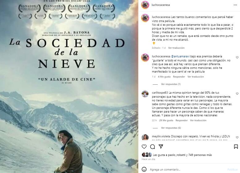 Lucho Cáceres opinó sobre la película de Netflix ‘La Sociedad de la Nieve’, que relata lo vivido por los pasajeros del vuelo 571 que se estrelló en Los Andes en 1972. Dicho largometraje está posicionado como número uno en dicha plataforma de streaming y por ello, varios usuarios se han sorprendido por los comentarios del actor.