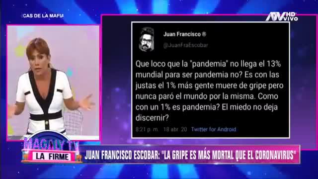 Magaly Medina utilizó unos minutos de su programa para arremeter contra el actor con Juan Francisco Escobar, ya que él minimizó la pandemia por coronavirus que azota al Perú y al mundo.