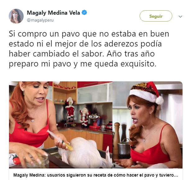 Tras la ola de críticas que recibió en su canal de YouTube por varios usuarios que siguieron su receta de cómo preparar el pavo navideño, Magaly Medina utilizó las redes sociales para pronunciarse sobre el polémico tema y defenderse de las críticas en su contra, luego de que varios la acusaran de haber malogrado su cena navideña.