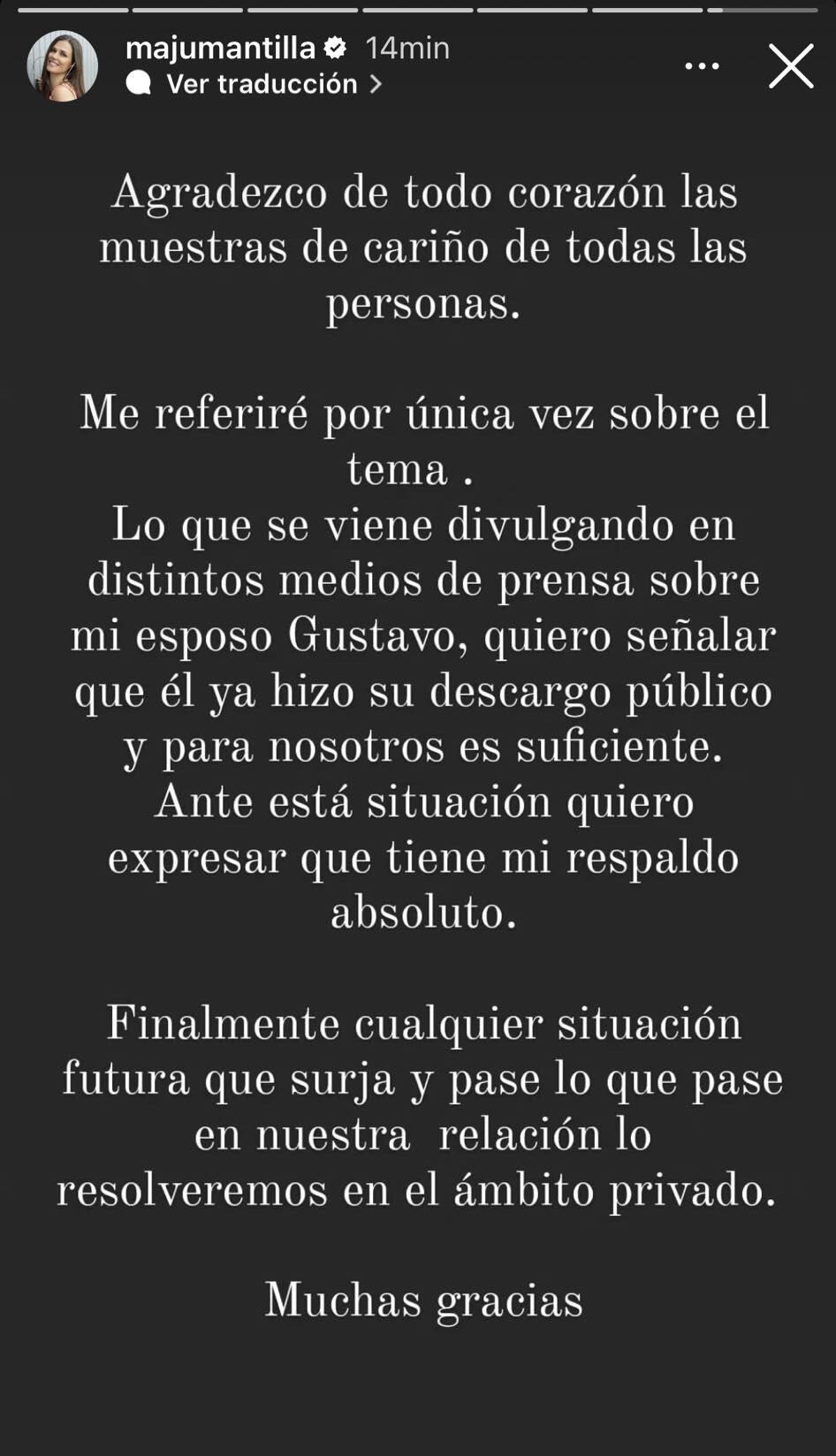“Agradezco de todo corazón el cariño de todas las personas. Me referiré por primera vez sobre el tema. Lo que se viene divulgando en distintos medios de prensa sobre mi esposo Gustavo, quiero señalar que él ya hizo su descargo público y para nosotros es suficiente. Ante esta situación quiero expresar que tiene mi respaldo absoluto”, se lee en las primeras líneas de la publicación.
