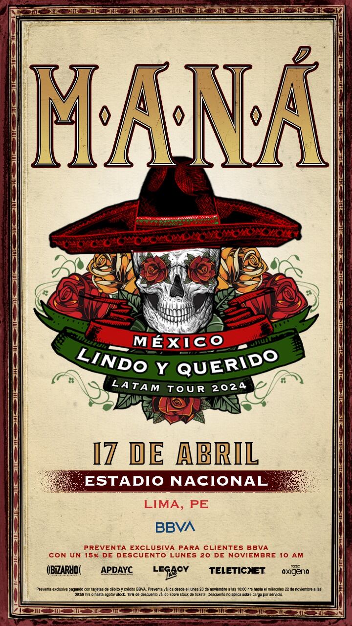 Maná, el grupo mexicano más importante del rock y pop latino, anuncia su gira internacional “México lindo y querido” que incluye una parada en Perú el próximo 17 de abril del 2024 en el Estadio Nacional para reencontrarse con sus fans. La preventa de entradas inicia este lunes 20 de noviembre a las 10:00 a.m. y la venta general comenzará el miércoles 22 de noviembre a las 10:00 a.m. por la web de Teleticket.