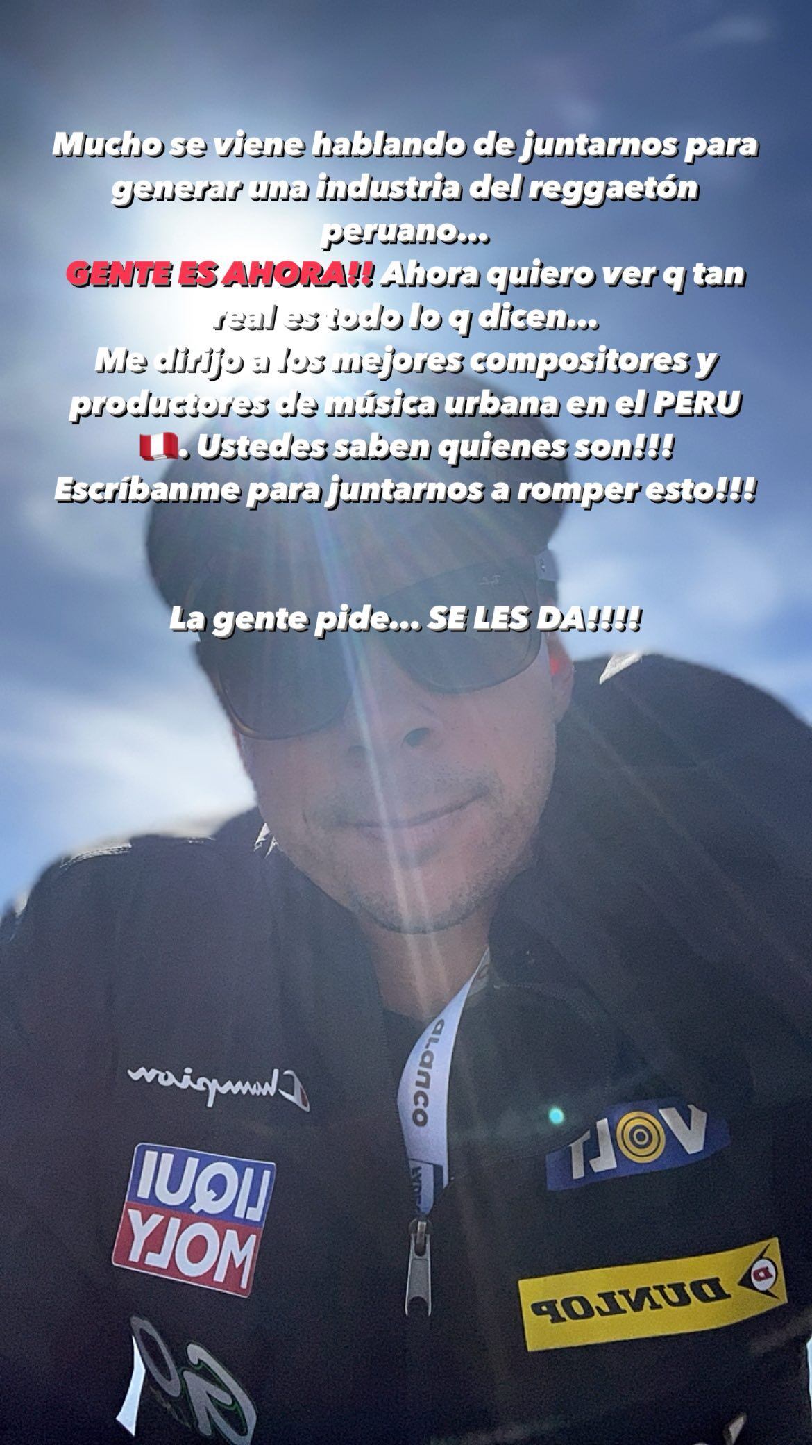 “Me dirijo a los mejores compositores y productores de música urbana en el Perú. Ustedes saben quiénes son. ¡Escríbanme para juntarnos a romper esto! La gente pide... se les da”, se lee en su ‘storie’ de Instagram.